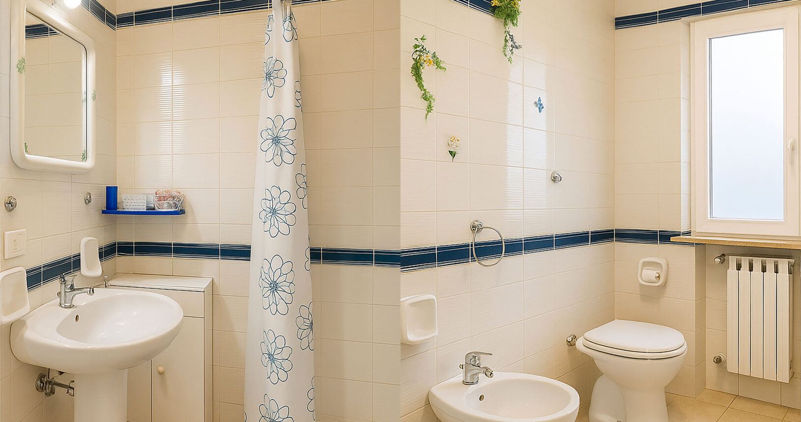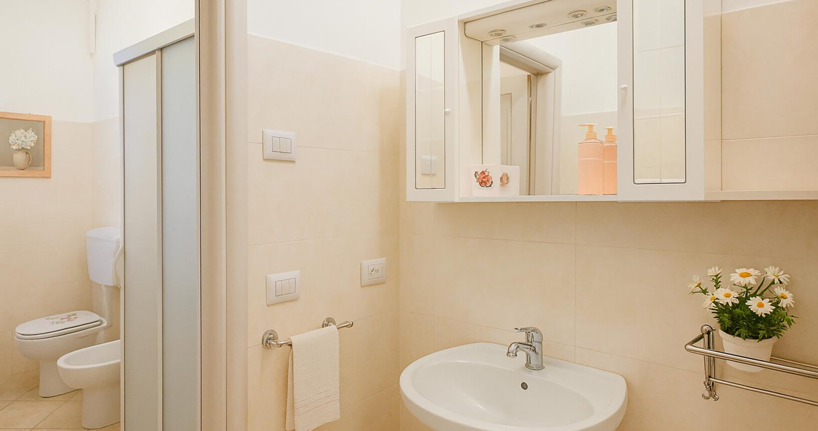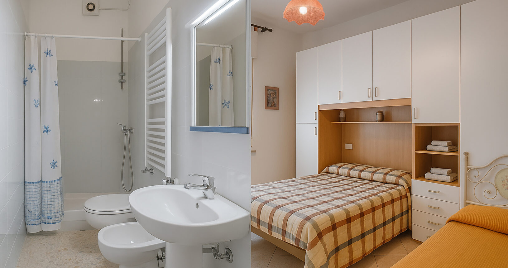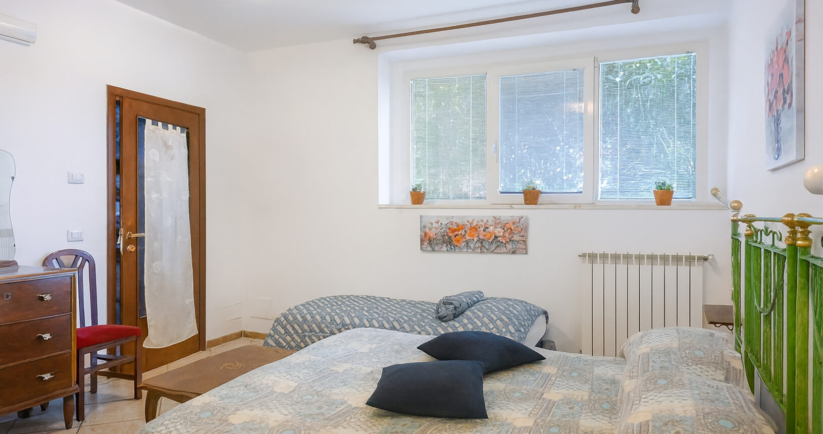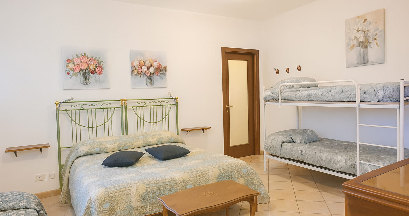 Camera matrimoniale + 1 letto singolo + 1 letto a castello per 2 posti, con bagno interno e giardino privato.